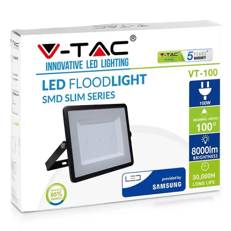 Reflector cu LED, cip Samsung , utere: 100 W (echivalent cu 500 W clasic) , 6400K (alb rece) , V-TAC SKU-414 , 220 - 240 VAC/50 Hz , 8000 lm , IP65 , dimensiuni 291 x 240 x 30mm .